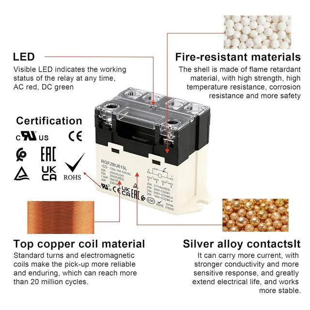 The shell is made of flame retardant material, with high strength, high temperature resistance, corrosion resistance and more safety UL, TÜV, CE, ROHS, CP, UKCA, EAC Certified for Quality Assurance Package Content: 10 x RGF Relay