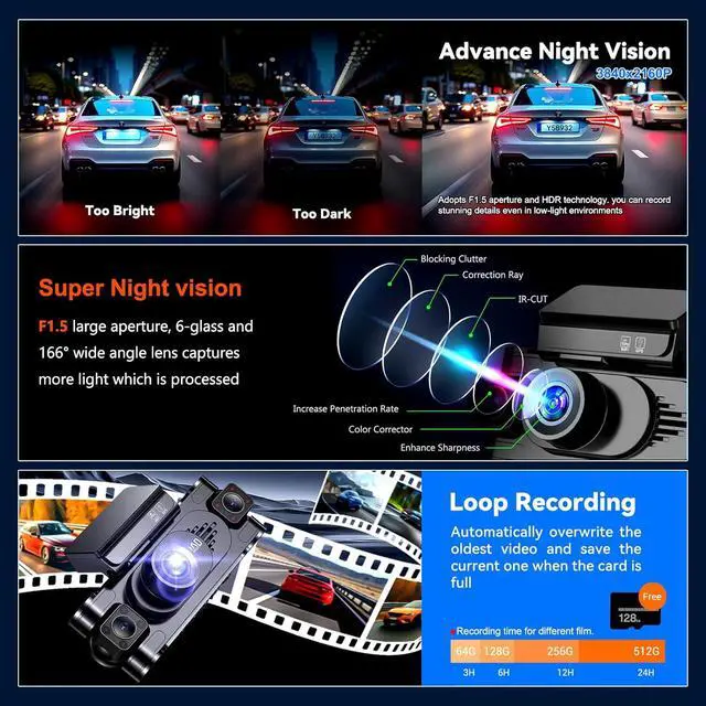 Loop recording-Free 128GB SD Card&G-Sensor It comes with a 128GB Micro-SD card (supports up to 256GB), Loop recording automatically overwrites the oldest files when storage is full. The adjustable-sensitivity G-sensor detects collisions and emergency-locks footage to the event folder, preventing critical evidence from being overwritten.