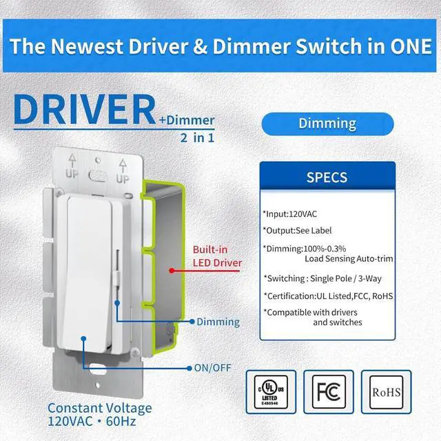 Transform your lighting experience with this innovative 2-in-1 LED dimmer switch and driver combination. This compact device efficiently handles both dimming and driving functions, streamlining your lighting control setup. Operating at 120V with a 96W capacity, it delivers a consistent 24V output, making it ideal for various LED lighting applications. The mini-sized design allows for flexible installation options while maintaining powerful functionality. Perfect for residential and commercial spaces, this switch provides smooth dimming control and reliable power delivery in one sleek unit. The device features straightforward ON/OFF operation alongside precision dimming capabilities, giving you complete control over your lighting atmosphere. Its space-saving design and dual functionality make it an excellent choice for both new installations and lighting system upgrades.