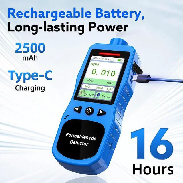 Rechargeable & Long Battery Life: This formaldehyde air tester built with 2500mAh rechargeable battery. A full charge lasts up to 16 hours of continuous monitoring, ensuring your safety and peace of mind. Equipped with carrying bag and back clip design, its convenient to take on the go.