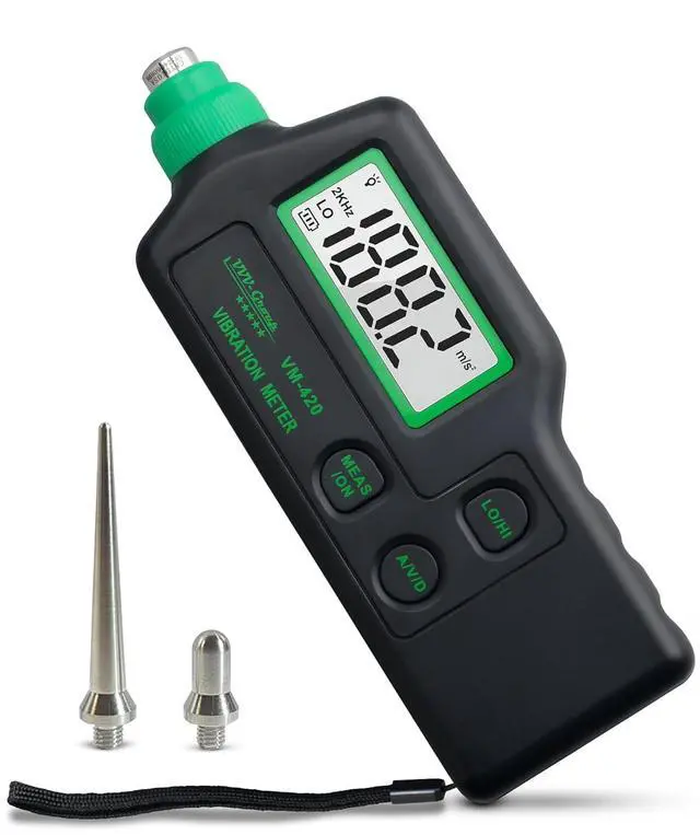 VERSATILE VIBRATION MEASUREMENT INSTRUMENT WITH SIGNAL OUTPUT: Compact, lightweight, and durable, the VM-420 vibration meter tool supports a magnetic spiral probe interface and AC signal output for connection to external analyzers or data loggers. Perfect for continuous machine vibration monitoring, balancing, and teng applications.