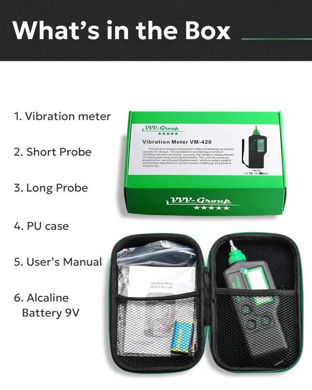 HIGH-SENSITIVITY PIEZOCERAMIC VIBRATION SENSOR: Equipped with a shearing-type piezoceramic vibration sensor, the VM-420 provides stable, accurate, and responsive vibration data. Includes both long and short probe heads plus a magnetic base for reliable contact on various surfaces ideal for vibration frequency measurement, torsional vibration analysis, and high-precision teng.