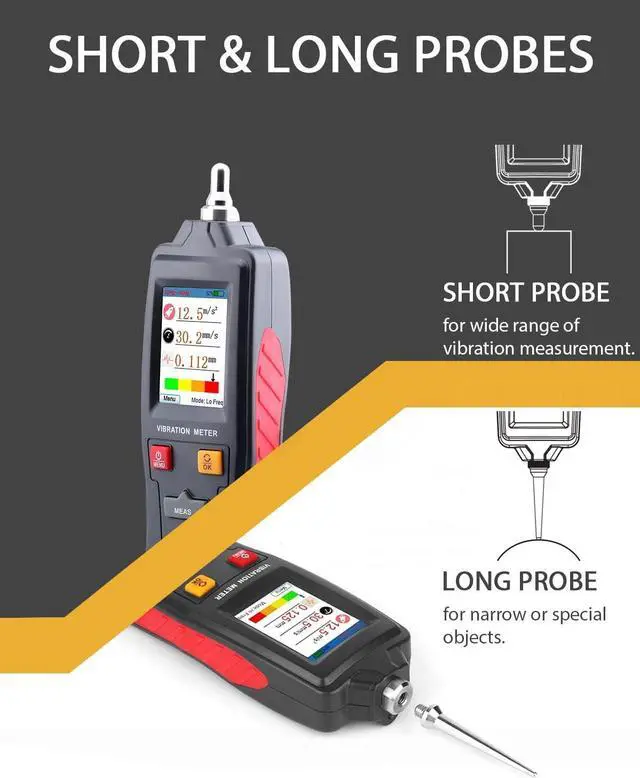 What You Get: 1x Mechanical Vibration Meter, 1x Short probe, 1x Long probe, 1x User manual, 2x AAA 1.5V Battery, and our worry-free 12-month warranty, and friendly customer service.