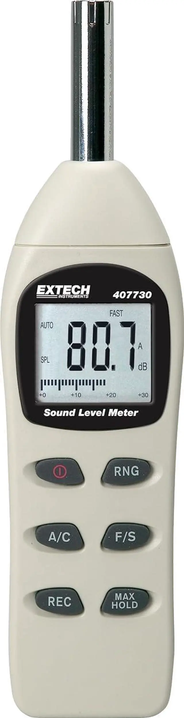 Economical meter measures sound decibel levels for a variety of workplace situations including workplace machinery monitoring and audio/alarm system checks. Meter features a 40 to 130 dB adjustable measuring range with selectable A/C weighting and fast/slow response. Digital display includes 0.1 dB resolution plus analog bar graph for easy readability. MAX Hold function stores loudest dB level reached and auto power off conserves battery life over time. Features a digital display with a user-friendly analog bar graph. Amazon. com