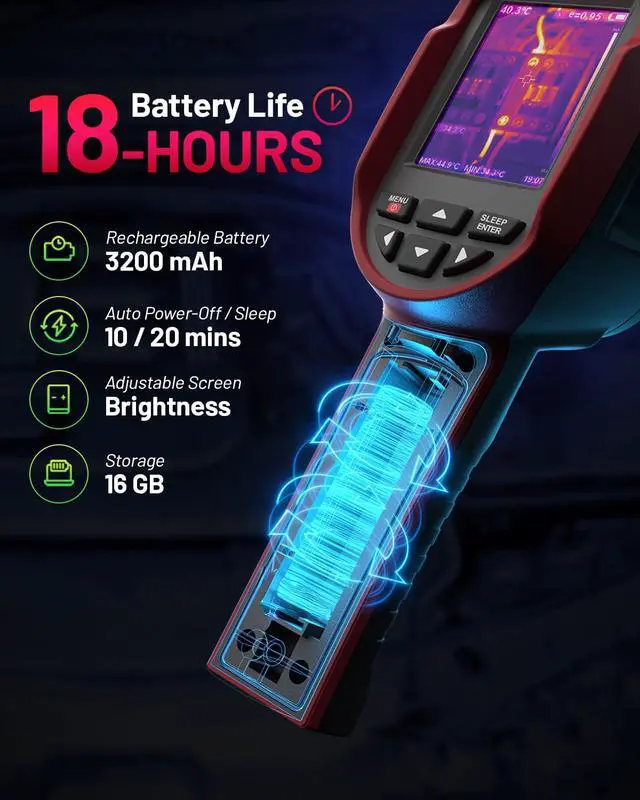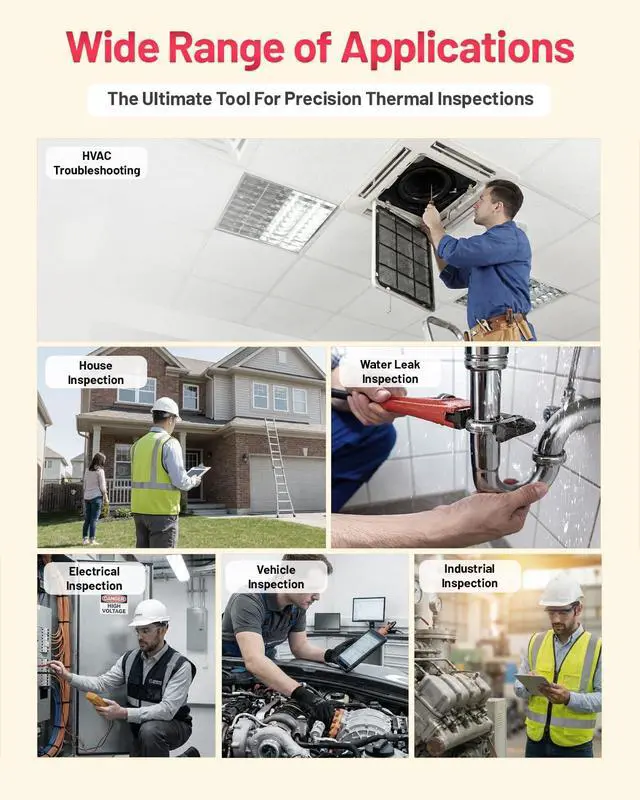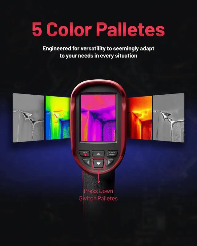 Wide Temperature Range & Easy Measurement Measure temperatures between -4°F to 1022°F with pinpoint accuracy. Automatically displays hot spots, cold spots, and center-point readings. Choose from multiple color palettessuch as Rainbow, Iron, Red Monochrome, Black Hot and White Hotto adapt to different working conditions and inspection ne.