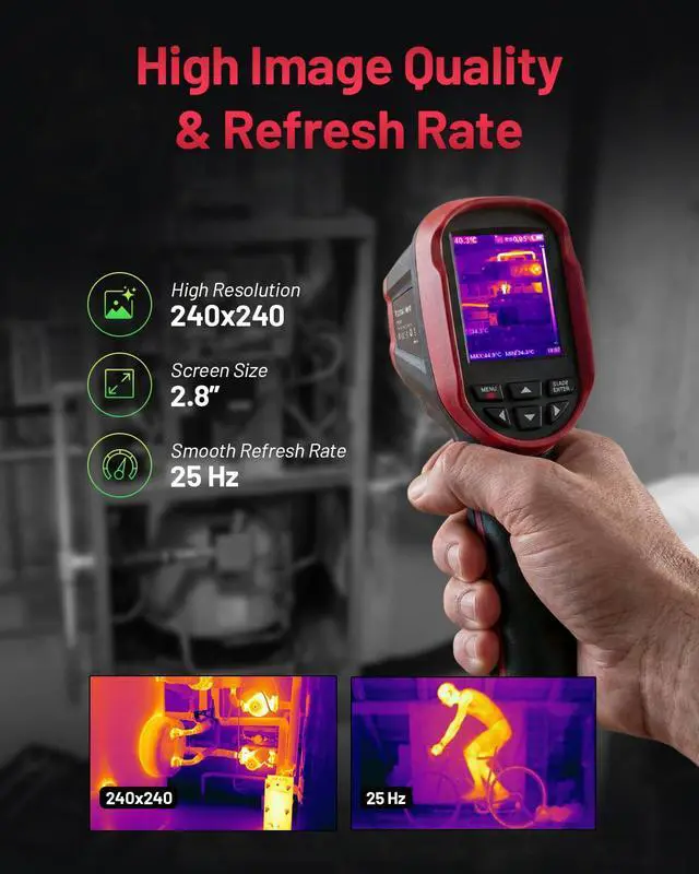 This compact thermal camera with 240 x 240 TSIR resolution delivers precise heat detection with an advanced sensor that captures differences as small as 0.04 °C. With accurate readings (± 3.6 °F/±2%), adjustable emissivity, real-time max/min/center tracking, and a built-in temperature alarm, it hs you quickly spot heat anomalies across any surface. Lightweight, durable, and easy to useideal for home inspections, HVAC, electrical, and automotive diagnocs.