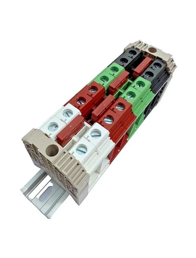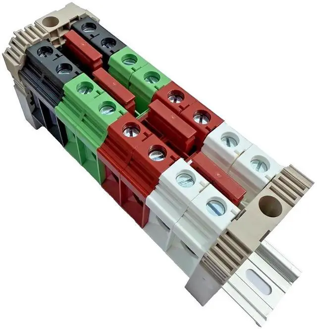 Jumper/Bridge: Press-fit/Insertion This assembly includes 2 DK35N-WE Dinkle terminal blocks, 2 DK35N-RD Dinkle terminal blocks, 2 DK35N-GN Dinkle terminal blocks, 2 DK35N-BK Dinkle terminal blocks, 2 SS6 end brackets, and 4 DSS35N-02PN press-fit jumpers, all mounted on a 8" piece of aluminum RoHS rail. There are 4 wire connections per color.
