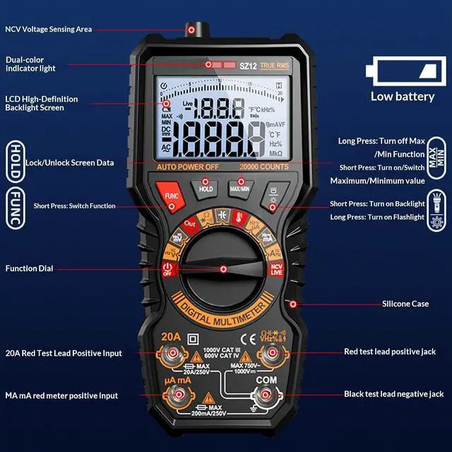 DETAILED TRMS VALUE OF SIX THOUSAND COUNT SECONDS Digital multimeter features six thousand counters for precise measurements and features automatic range selection for potential, current, resistance, capacity and NCV.