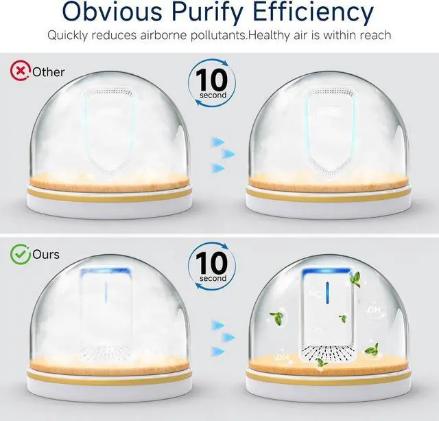 Compact Design: This portable ionizer blends discreetly into your home or office. Small and lightweight design makes it perfect for bedrooms, kitchens, bathrooms, garages, or even for travel