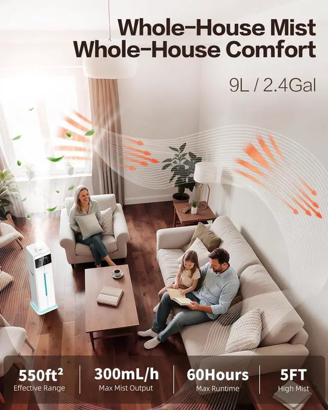 [ Powerful Whole-Room Humidification Breathe Easy Anywhere ] Our high-performance humidifier delivers rapid, room-filling comfort 300mL/h high moisture output is designed to humidify the air for cover up to 550 ft², with a powerful 2500 RPM motor, it projects a strong mist over 5 feet high, spreading balanced humidity corner to corner. air humidifier works efficiently to moisturize your entire room fast perfect for bedroom, living rooms, offices, yoga spaces, nurseries, plant room.