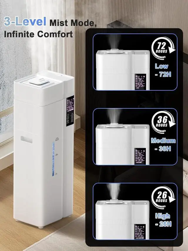 • 13L Large Capacity Humidifier & 72H RuntimeOur humidifier features a 13L large water tank that provides up to 72 hours of continuous humidification on the low setting, eliminating frequent refills. Its powerful 500 ml/h mist output efficiently humidifies spaces up to 800 sq ft, helping to maintain continuous comfort in bedrooms and offices, and supporting comfortable humidity levels for both your home and your indoor plants