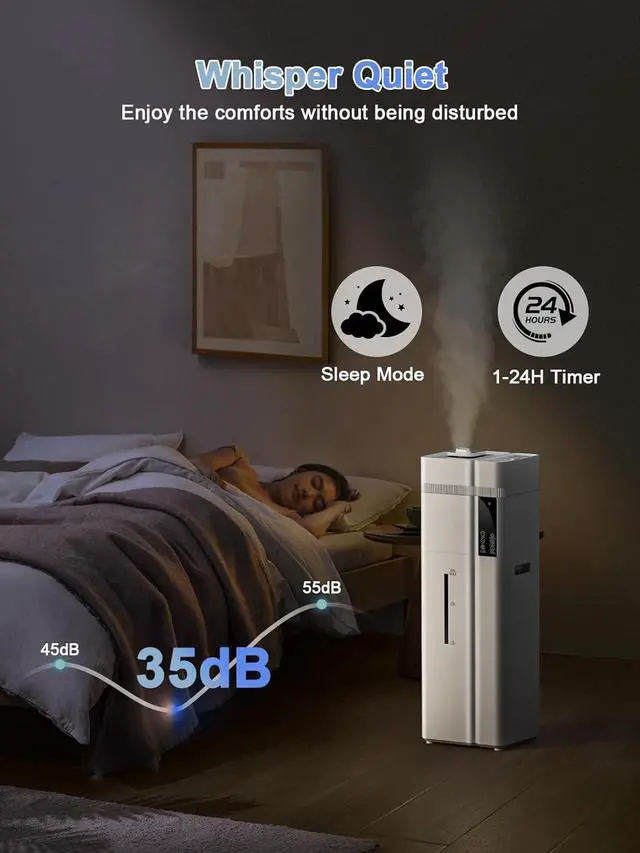 Smart 24H Timer & Auto Safety Shut-OffPersonalize your humidifier's schedule with the flexible 1-24 hour timer. The convenient top-fill design simplifies refilling and helps prevent spills. For added safety, the built-in auto shut-off feature turns off the humidifier when the water level is low, protecting the device and providing peace of mind