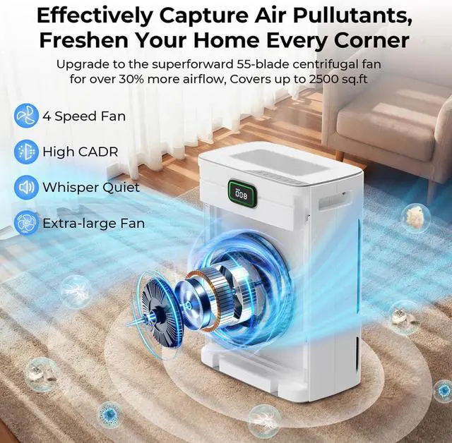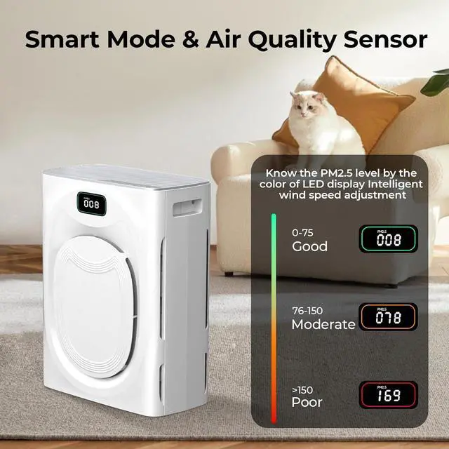 Air Quality Monitor: This air purifier for home is equipped with a dust sensor and will display the real-time air quality level on the air purifier screen. In Auto mode, the fan speed will be automatically adjusted to protect your air quality when you rest. You can also remotely control the machine's on/off, wind speed adjustment, timing and other functions through the Smart Life APP, making it more convenient to use