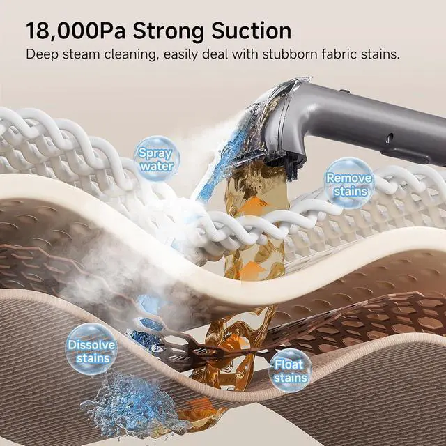 Easy to Use: The upholstery cleaner machine uses capacitive buttons instead of a press design, which can further help you relieve hand fatigue, making it easy and efficient. For safety reasons, press the hot water button once to switch on/off the hot water mode, and press the steam button twice to switch on/off the steam mode. Switching is also easy, simple, and safe.