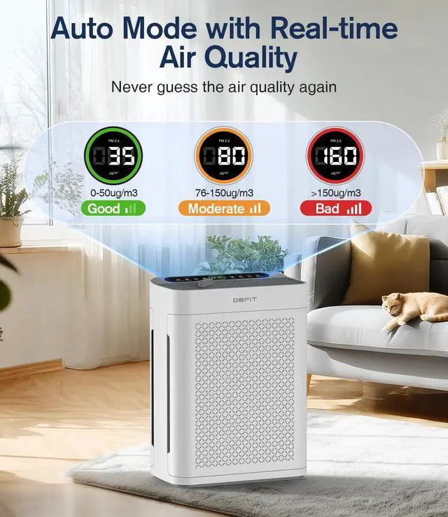 PM 2.5 AIR QUALITY DISPLAY & AUTO MODE: The AP300 HEPA air purifier is equipped with an upgraded PM 2.5 particle sensor, which can more accurately and quickly monitor the air quality in real-time and show it on the display, no more guesswork about your air health. In Auto mode, this smart air purifier will change its indicator light and automatically adjust the wind speed according to the surrounding air quality. It is recommended to use the auto mode, which is not only intelligent but also energy-saving.