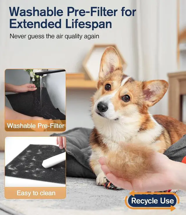 FILTER REPLACEMENT REMINDER: This air purifier with washable filter has a filter change reminder function. When the filter reaches the end of its service life, the indicator lights up to remind you to replace it. You can also clean the pre-filter to extend its service life. We recommend replacing the air purifier filter every 3-6 months and using the official filter to ensure optimum performance. (The official replacement filter can be purchased on Amazon by searching B0FCMK62QV. )