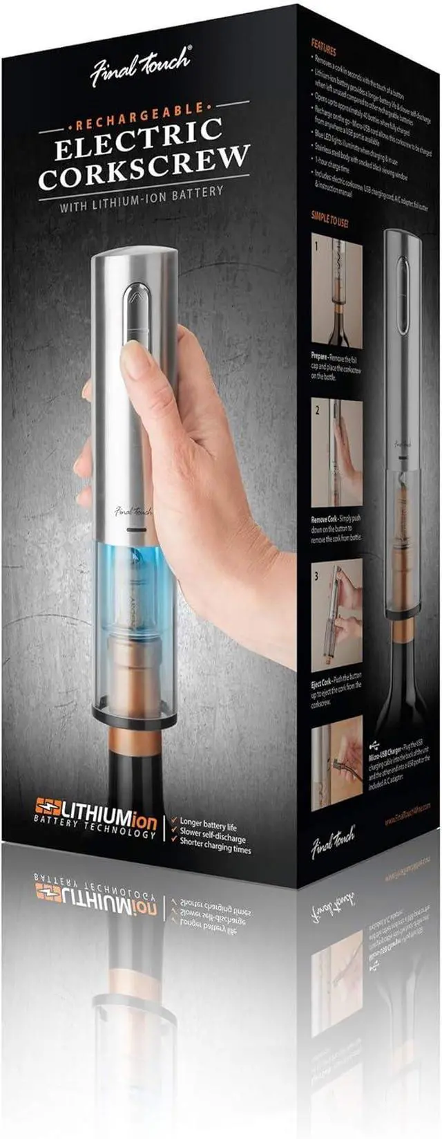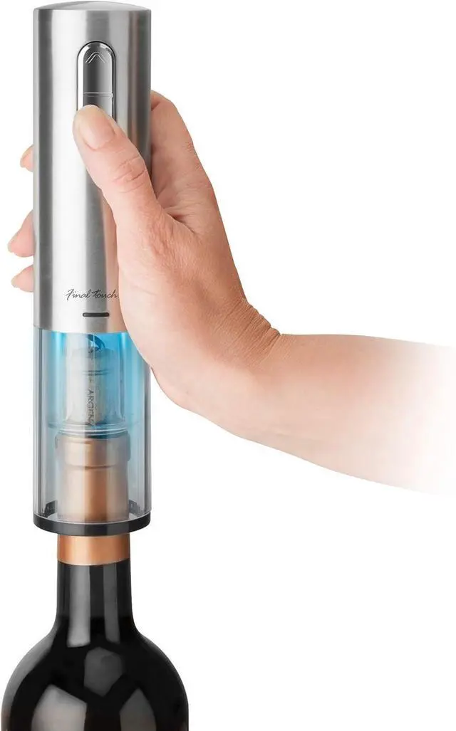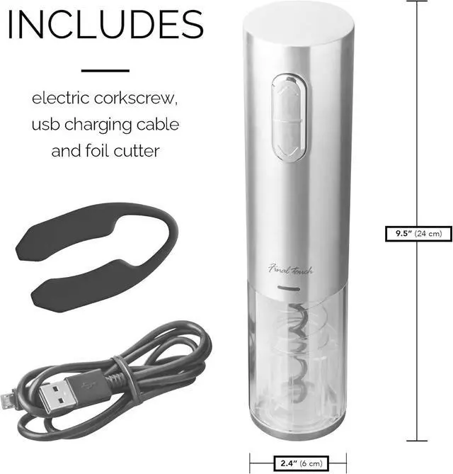 Remove a cork in seconds with the touch of a button and without any tugging or pulling. Made with a Lithium-ion battery that provides a longer battery life & slower self-discharge when left unused compared to other rechargeable batteries. The included micro-USB charging cable allows the ability to charge up almost anywhere. Built-in Blue LED lights illuminate when charging & in use and the sleek brushed stainless steel body with smoked black viewing window looks great in any setting. Easy-to-use!