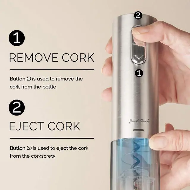 Eject Cork - Push the button up to eject the cork from the corkscrew. Removes a cork in seconds with the touch of a button