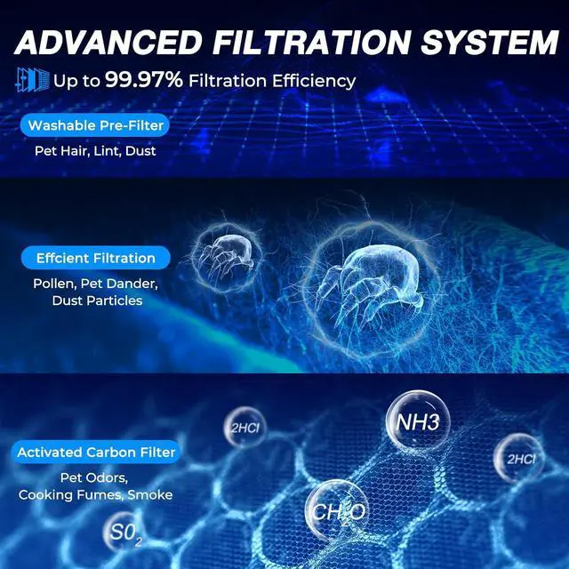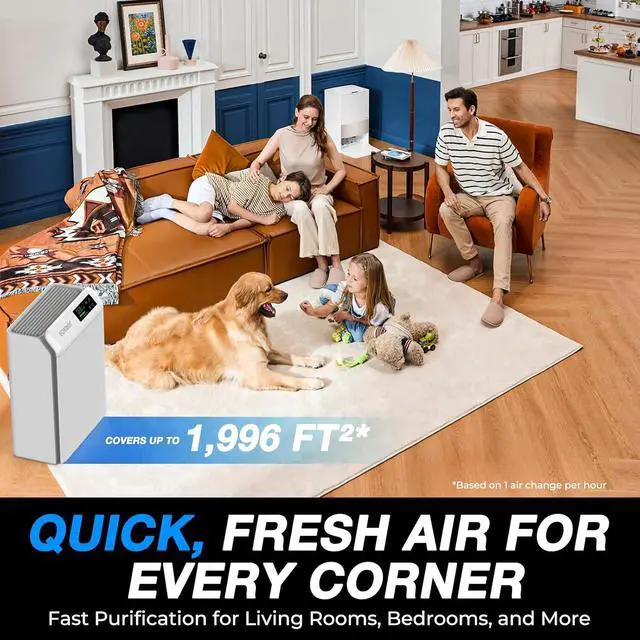 FILTER REPLACEMENT REMINDER & EASY RESET: air purifier is equipped with a filter replacement indicator that adjusts based on your specific environment and usage frequency, ensuring timely reminders when a filter check or replacement is neededtypically every 612 months. After installing a new filter, simply press and hold the Speed button for 7 seconds to reset the indicator. A compatible replacement filter is available on Amazonsearch B0FK4DL5D5ideal for air purifiers for home pets
