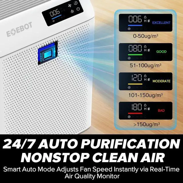 INTELLIGENT AIR QUALITY MONITORING: Stay informed with our intelligent air quality monitoring system. This air purifier for large room uses built-in sensors to detect and display real-time PM 2.5 levels on the LED screen. A clear, color-coded bar and numerical value give you instant insight into your current air quality. In auto mode, this air purifier for bedroom adjusts fan speed based on these readings, ensuring optimal purification without you having to lift a finger