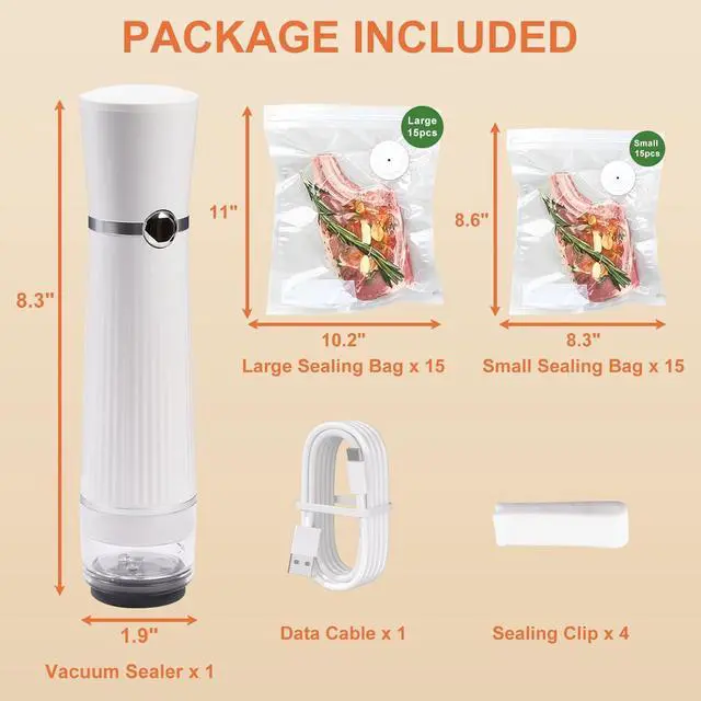 Premium Gift Box Packaging: Packaged in a premium colorful gift box, the set includes 1 handheld vacuum sealer, 30 reusable eco-friendly vacuum bags (in two sizes), 4 sealing clips, 1 USB-C charging cable, and 1 user manual. Its a practical and elegant gift choice for family and friends.