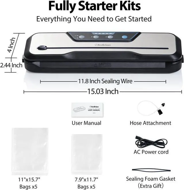 Package includes: 10 x Heat-seal bags (11"* 15.7" x 5pcs, 7.8" * 11.8" x 5pcs), 1 x Extra Gasket Replacement, 1 x External air suction hose, 1 x Food Vacuum Sealer Machine, 1 x User Manual, 1x AC Power Cord.