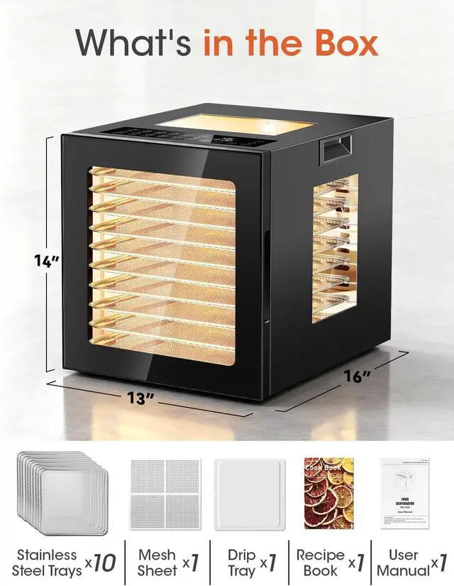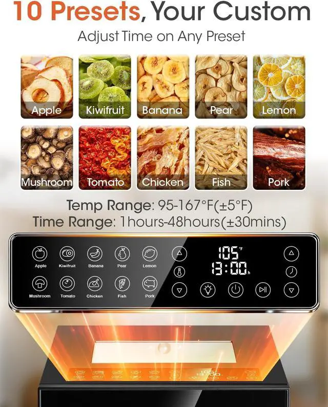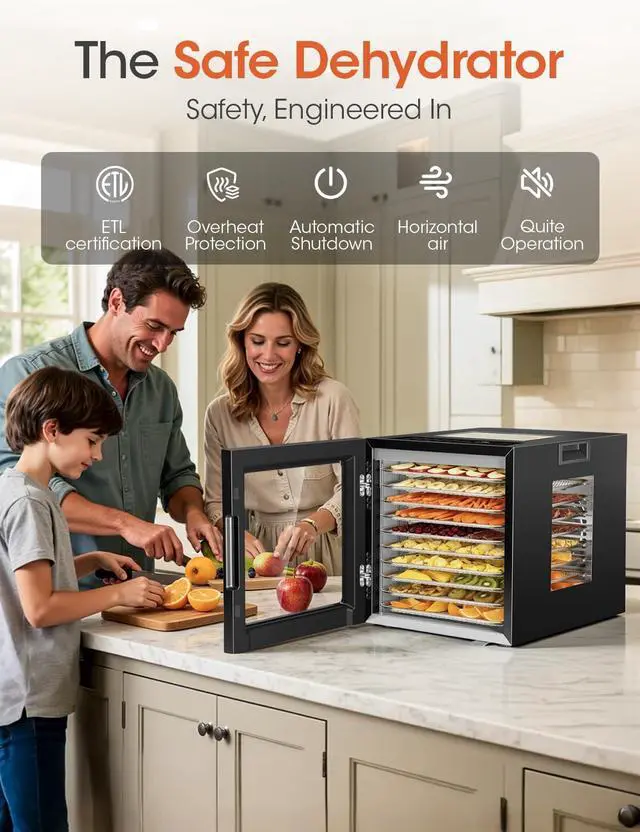 &: Designed for peace of mind and quiet operation. Our dehydrator is ETL certified and features overheat protection for added safety. Its energy-efficient design runs quietly in the backgroundideal for overnight useso you can wake up to perfectly dried goodness without disturbance.