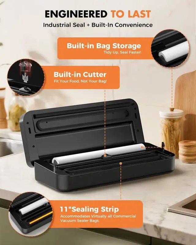 Built-in Cutter & Storage and One-Hand Operation Custom-cut bag sizes in seconds with the integrated blade and store vacuum rolls internally using the built-in compartment. The single-press buckle mechanism simplifies operation no clamps or complex latches required.