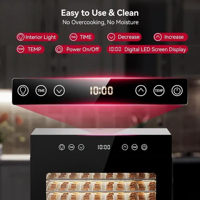 Low-Noise Operation with Interior Illumination: Experience peaceful dehydration, day or night! The quiet motor and built-in interior light allow you to check on your food without noise or disruption. This dehydrator is excellent for preparing nutritious snacks anytime without disturbing your family.