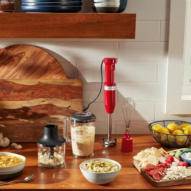 Model khbv83 includes (1) corded hand blender, (1) dishwasher-safe blender arm, (1) whisk attachment, (1) chopper attachment, (1) blending pitcher with lid, (1) pan guard