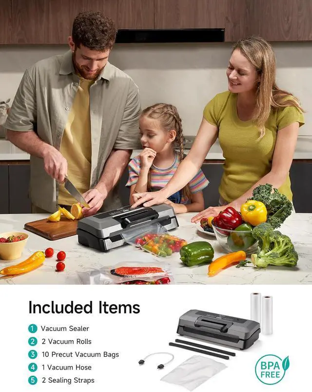 Fully-Featured Vacuum Sealer: H700 provides a suite of accessories to meet all your vacuum sealing needs. The sealer includes 10 BPA-free vacuum bags (8" x 12"), 2 rolls of bags (11"x 16'), 2 sealing straps, and 1 vacuum hose