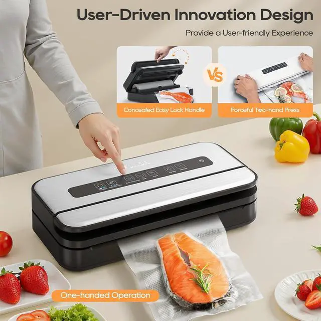 Easy-Lock Handle & Stylish Design: Design with patented concealed and easy lock handle, the lid can be easily locked by pressing it with one hand instead of two, ensuring a secure, tight seal, simplifying the sealing process for ultimate convenience and user-friendliness. Seal a meal vacuum sealer machine sleek stainless steel body is durable, stylish, and easy to clean. Comes with BPA-free, diamond-pattern vacuum sealer bags & rolls that are puncture-resistant and tear-proof.