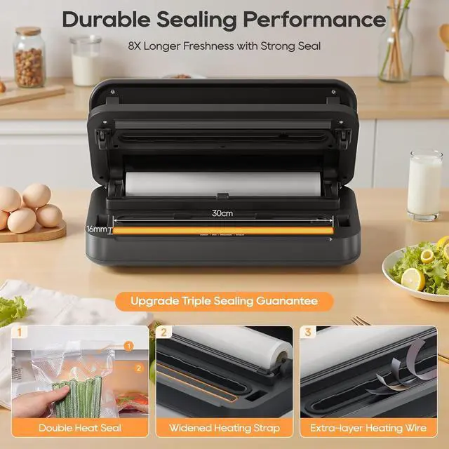 What To Get & 5 Years Warranty: This vacuum food sealer saver machine comes with 1* Vacuum Sealer Machine, 1*Extra Foam Gasket, 1*External Vacuum Tube, 2*Vacuum Roll, 5*pcs Multi-functional pumping vacuum bags 1* User Manual. And we offer the vacuum sealer 5 years warranty; if you have any problem, please give us a chance to help you.
