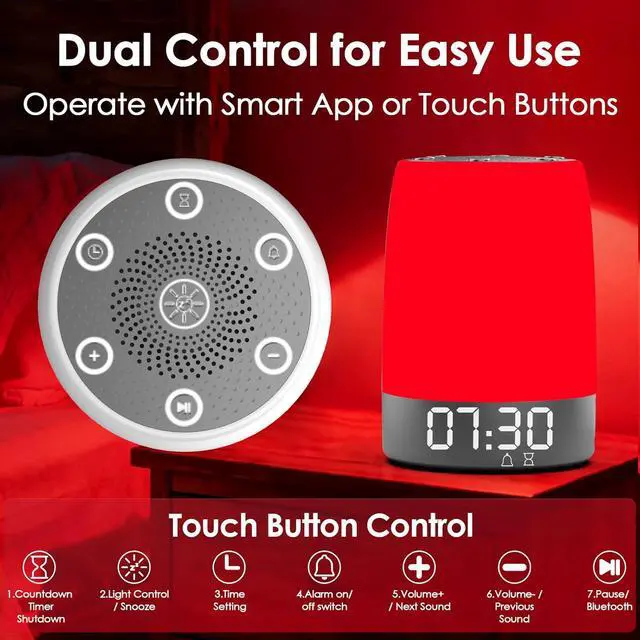 Dual Control: Smart App + Touch Buttons for Effortless Customization Manage your sleep setup with zero hassle via intuitive touch buttons on the device or remote Smart App control. Adjust brightness, switch red light wavelengths, select white noise tracks, set timers, and schedule alarmsall in one place. The memory function saves your last preferences for seamless routine continuity.