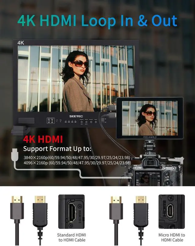 Full Range of Auxiliary FunctionsF7 PLUS dslr monitor has lots of professional monitoring functions, such as waveform, vector graph, histogram etc. can help you accurate exposure and focus. HDMI support up to 4096x2160/60p &3840x2160/60p signal, compatible with DSLR, camera and camcorders