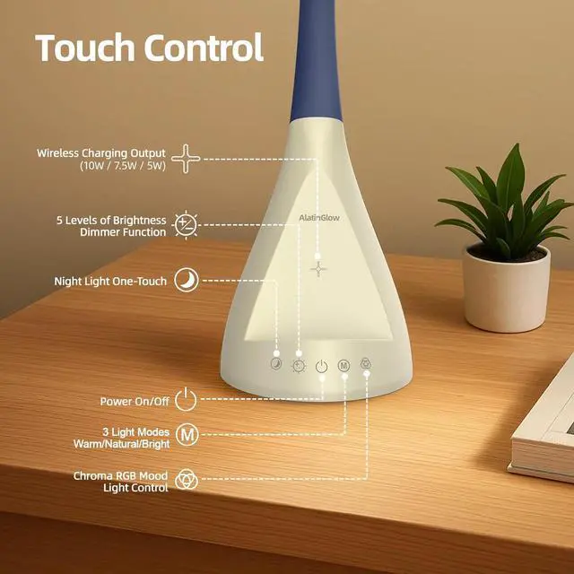 Dual-Power Hub Base USB-C powered lamp (adapter included) + Qi wireless charging pad built into base. Charge phones by placement10W fast charging. No cable clutter.