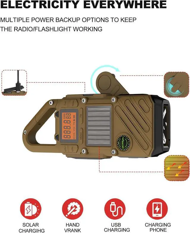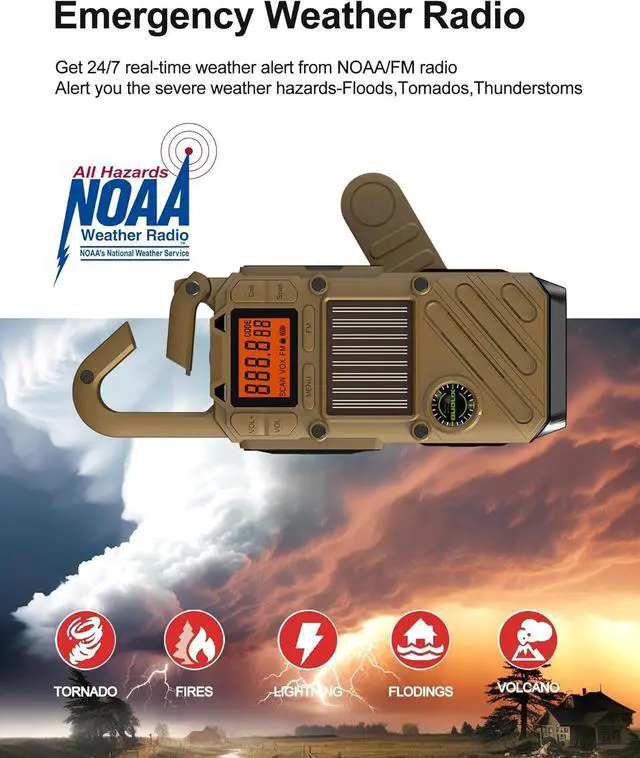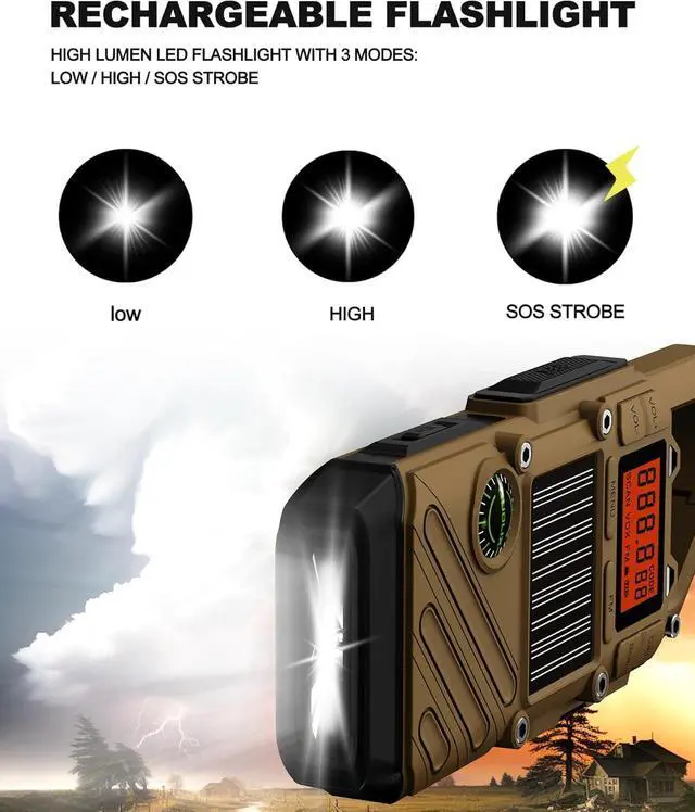 2000mAh Power Bank and 3 Charging Mode - The rechargeable weather radio with multiple power backup options will be the best choice for the emergency package. It has built-in a 2000mAh rechargeable battery to charge your phone, tablets, or other USB-powered devices. Once the crank radio shows low battery, the solar panel and the hand crank lever can regenerate enough power to keep the emergency radio, lights, and SOS working.