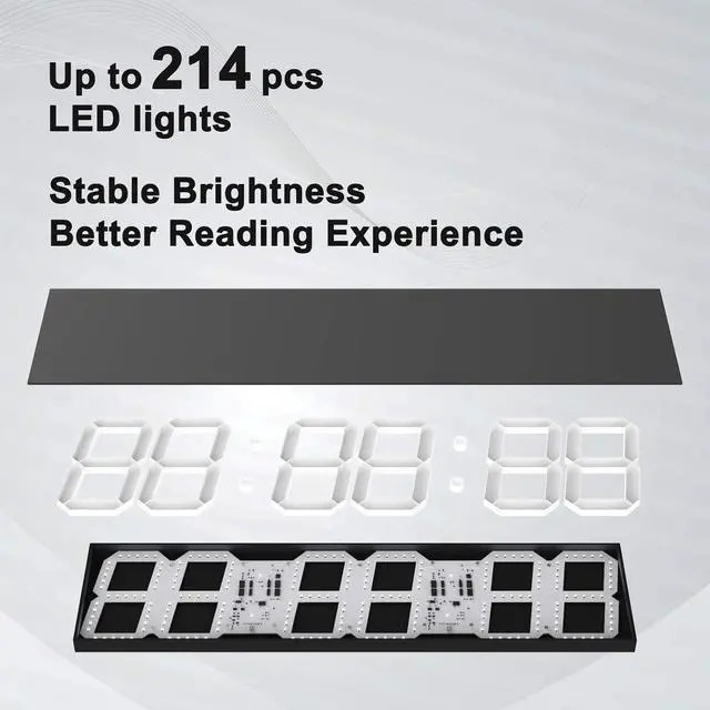 Better Material for the Large Digital Wall Clock: The digital clock display board cover is made of acrylic, the shell is made of high-strength integration ABS material, ensure the digital clock is light and strong. 214 pcs Led lights of the clock, make sure of your reading experience. The big digital wall clock is powered by a 10-foot power cord for more of your installation needs.