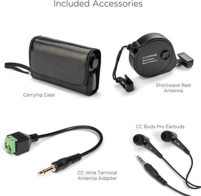 Includes shortwave antenna jack that can significantly improve shortwave reception when used with an external antenna. High quality CC Buds Earphones, faux leather radio carry case and 23 ft portable Shortwave reel antenna also included.
