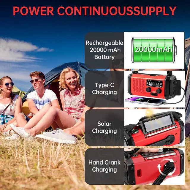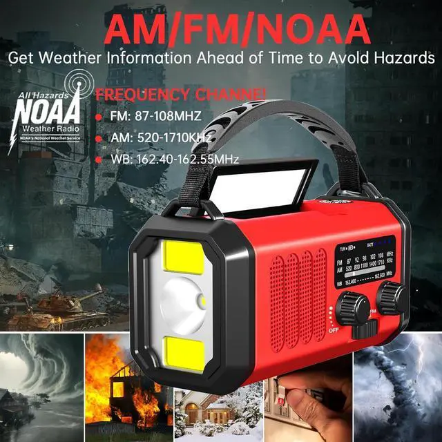Ways Chargering Radio: crank weather radio supports charge by solar, hand crank, Type-C, will provide continuous power to the radio and no worry about power off.