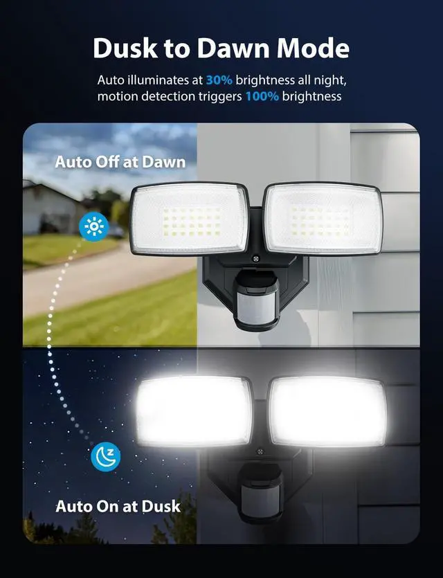 IP65 Weatherproof: With an IP65 waterproof rating, these outdoor motion lights for house are built to withstand harsh weather conditions, including high temperatures and freezing cold, making them ideal for year-round use.