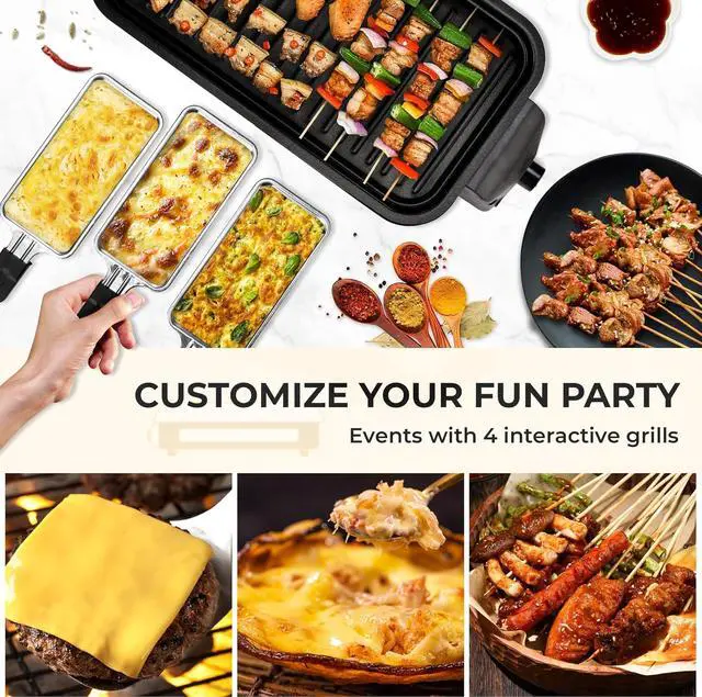 RACLETTE TABLE GRILL FOR TWO PERSONSThis indoor grills electric smokeless is perfect for small families, couples, and individuals living alone. It comes with 3 mini raclette pans, providing enough space for grilling. Simply plug in the electric grill, set the desired temperature, and prepare low-fat, healthy meals with ease