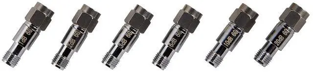 A convenient package of 6 50 SMA in-line attenuators. Allows for selecting attenuation from 1db-42dB in 1dB increments. Includes values of 1dB, 2dB, 3dB, 6dB, 10dB and 20dB.