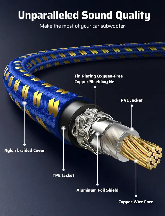 Premium Connectivity Includes professional-grade RCA cables with 24K gold-plated connectors and dual shielding for noise-free transmission in car audio subwoofers. 90-degree angled connectors ensure easy installation in cramped areas while preventing cable damage.