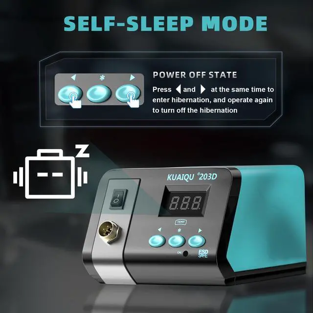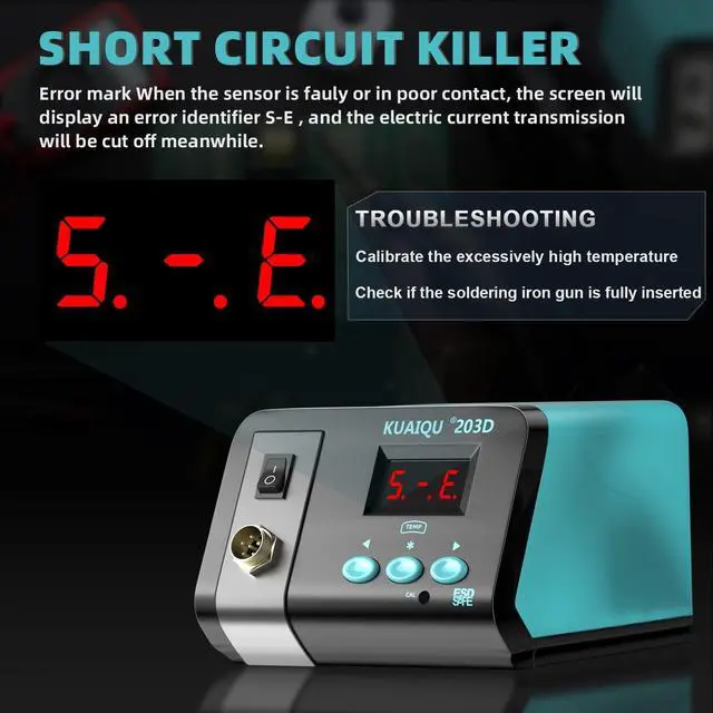 CAL Temperature Calibration: The soldering station is equipped with a temperature calibration function to help correct temperature discrepancies. Turning the CAL knob clockwise increases the temperature, while turning it counterclockwise decreases it.