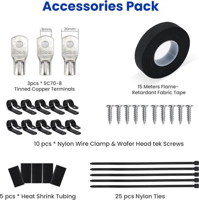 Complete Installation Accessories: Includes 5-piece installation kit with tinned copper terminals, heat shrink tubing, and cable clamps. Pre-crimped terminals feature anti-oxidation design, making it easy for beginners to install quickly. Technical