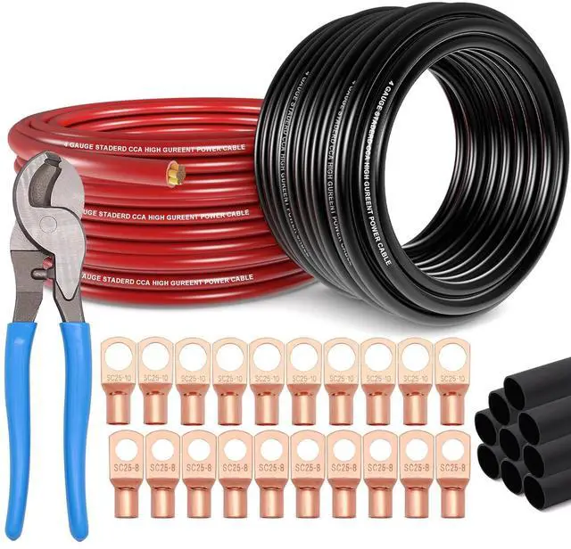 PACKAGE - 4 gauge black/red CCA power ground wire (25 feet of each color) 1 x Cable Cutter10PCS AWG4-5/16(SC25-8) Lugs10pcs AWG4-3/8(SC25-10) Lugs20pcs Heat Shrink Tubing.