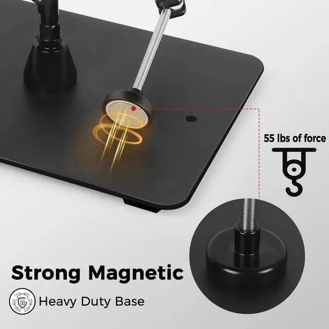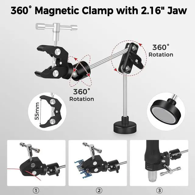Magnetic Soldering Clamp with 2.16 -inch Jaw OpeningThe adjustable friction soldering clamp comes with 1/4" screws, while the super clamp features both 1/4" and 3/8" threads. NotePlease secure the arm in place by firmly tightening the nut. Made from durable aluminum alloy and stainless steel, its built to withstand wear and resist rust. The magic arm supports up to 4.4 lbs (2 kg) for reliable performance.