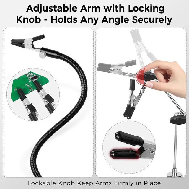 Sturdy Flexible Arms with 360° Alligator ClampsIncludes 4 durable steel arms2 at 14" and 2 at 9.8" with stainless steel clamps that rotate 360° keeping components steady for soldering, crafting, and repair.