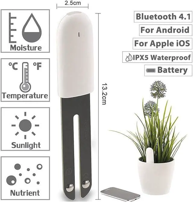 Automatically Monitors Fertility- EC Sensor Accurate Soil Nutrient Detection with 4 EC sensors can detect soil nutrients and convert them into scientific data to display on your smartphone. This database provides perfect nutrient interval values for different plants. The EC sensor is made of stainless steel, which increases the reliability of in-ground flower care for long-term use